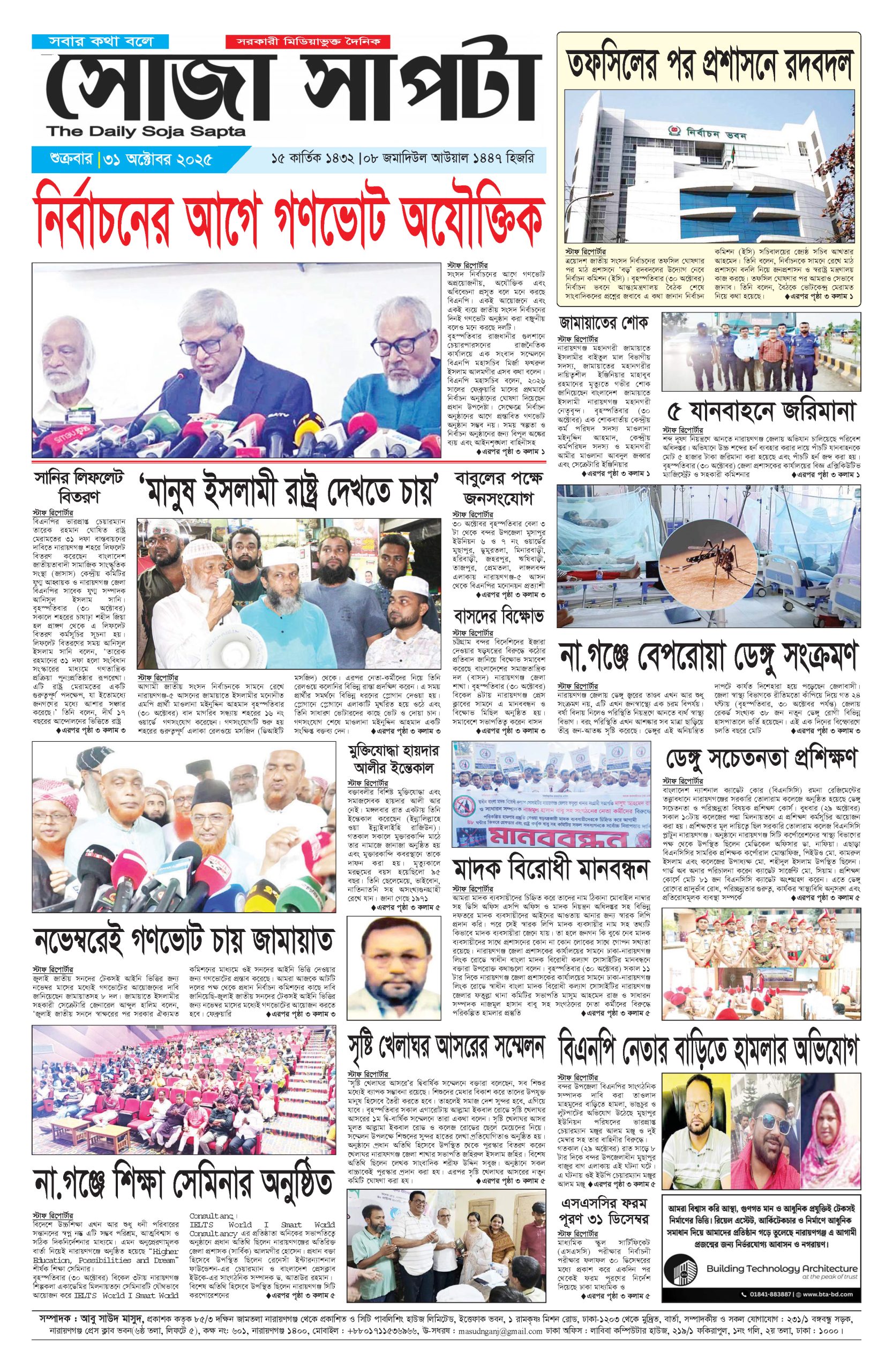 সম্পাদক : আবু সাউদ মাসুদ, সিটি পাবলিশিং হাউজ লিমিটেড, ইত্তেফাক ভবন, ১ রামকৃষ্ণ মিশন রোড, ঢাকা-১২০৩ থেকে মুদ্রিত, সম্পাদকীয় ও সকল যোগাযোগ :২৩১/১ বঙ্গবন্ধু সড়ক, নারায়ণগঞ্জ প্রেস ক্লাব ভবন(৬ষ্ঠ তলা, লিফটে ৫), কক্ষ নং: ৬০১, নারায়ণগঞ্জ ১৪০০, মোবাইল : +৮৮০১৭১১৫৩৬৯৬৬, E-mail : masudnganj@gmail.com ঢাকা অফিস : লাবিবা কম্পিউটার হাউজ, ২১৯/১ ফকিরাপুল, ১নং গলি, ২য় তলা, ঢাকা : ১০০০